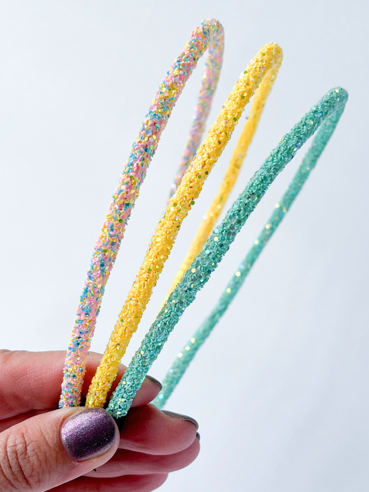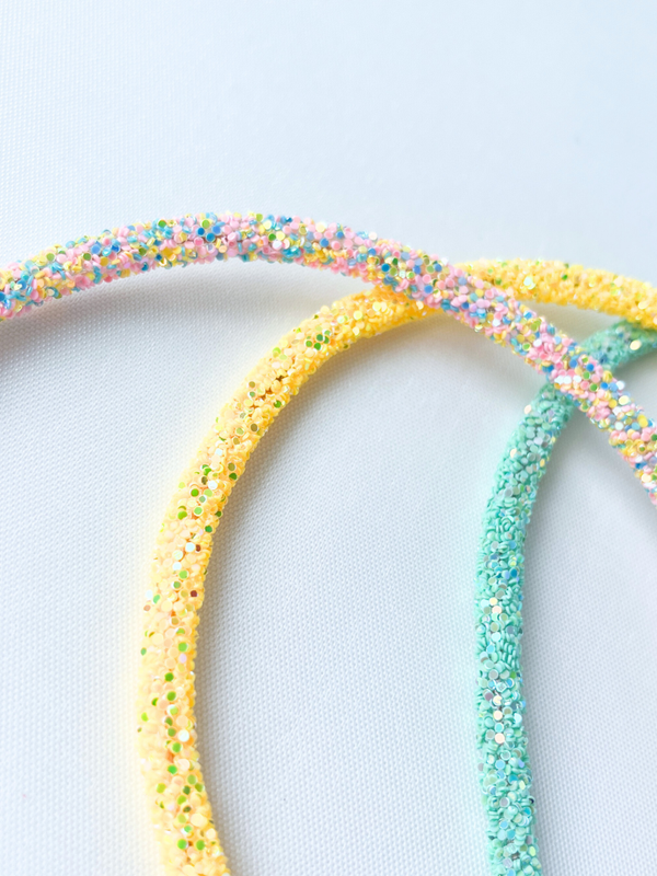 Dunne lichtgewicht haarbanden, all-over afgewerkt met vrolijk gekleurde glitters. Aan de uiteinden zijn de haarbanden afgewerkt met zacht materiaal zodat het niet gaat schuren achter de oren.