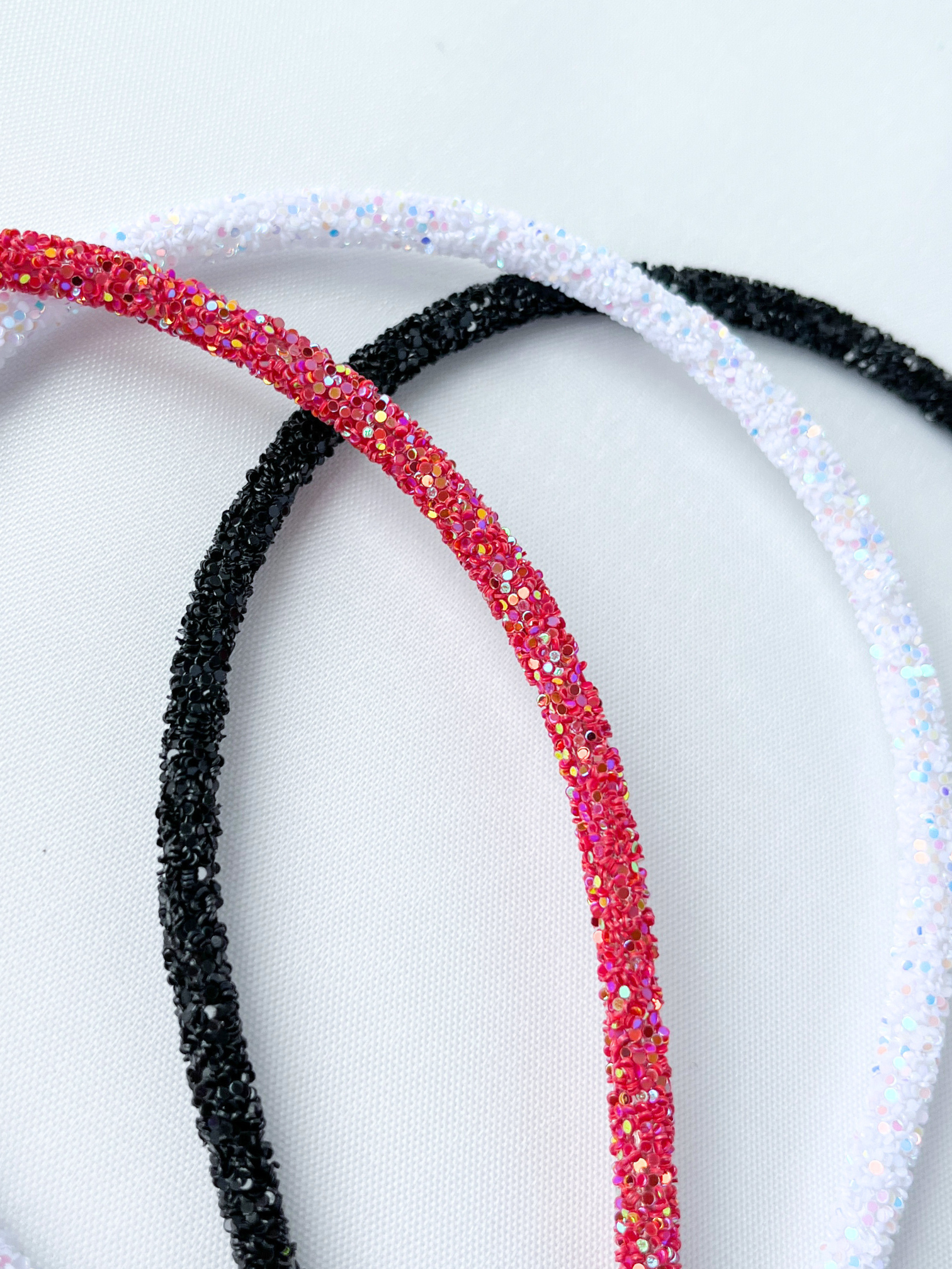 Dunne lichtgewicht haarbanden, all-over afgewerkt met vrolijk gekleurde glitters. Aan de uiteinden zijn de haarbanden afgewerkt met zacht materiaal zodat het niet gaat schuren achter de oren.