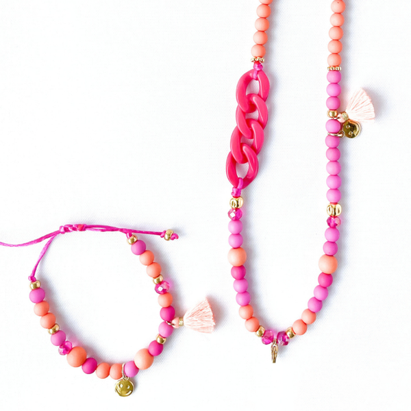Deze stoere ketting is gemaakt van hoogwaardige materialen, waardoor de ketting lang mooi blijft en jouw kindje er lang van kan genieten. De ketting heeft een vrolijke kleurencombinatie van roze en oranje met leuke goudkleurige details. En is afgewerkt met een roze schakelketting en een bedeltje met een smiley.