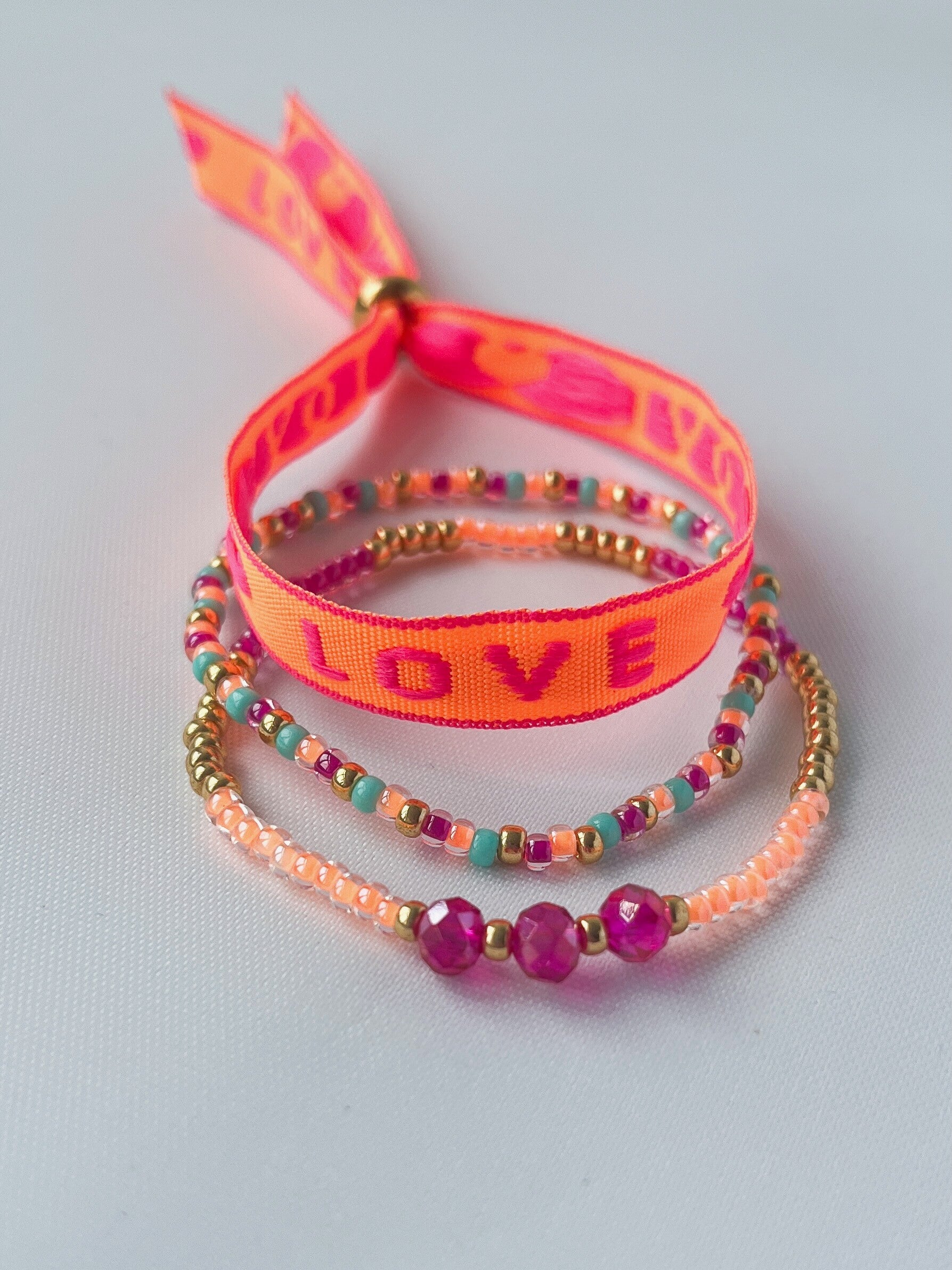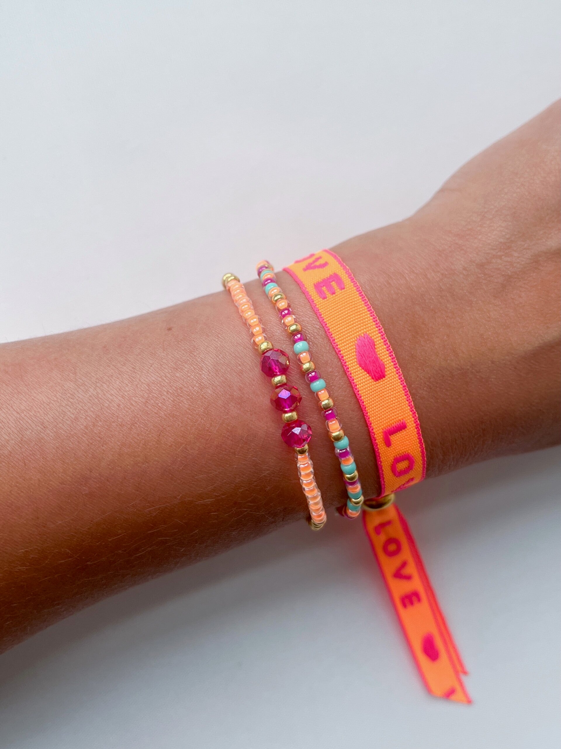 Het 3e armbandje is een hip lintarmbandje in neon oranje met roze met de tekst 'Love'. Het lintarmbandje is makkelijk in maat te verstellen met de gouden kraal, gemaakt van stainless steel.