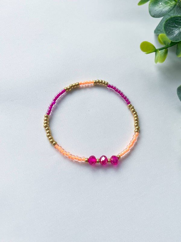 Het 2e armbandje is gemaakt van Miyuki kralen in diezelfde kleuren fuchsia roze en neon oranje met goud, afgewerkt met drie prachtige fuchsia roze kleurige facetkralen.