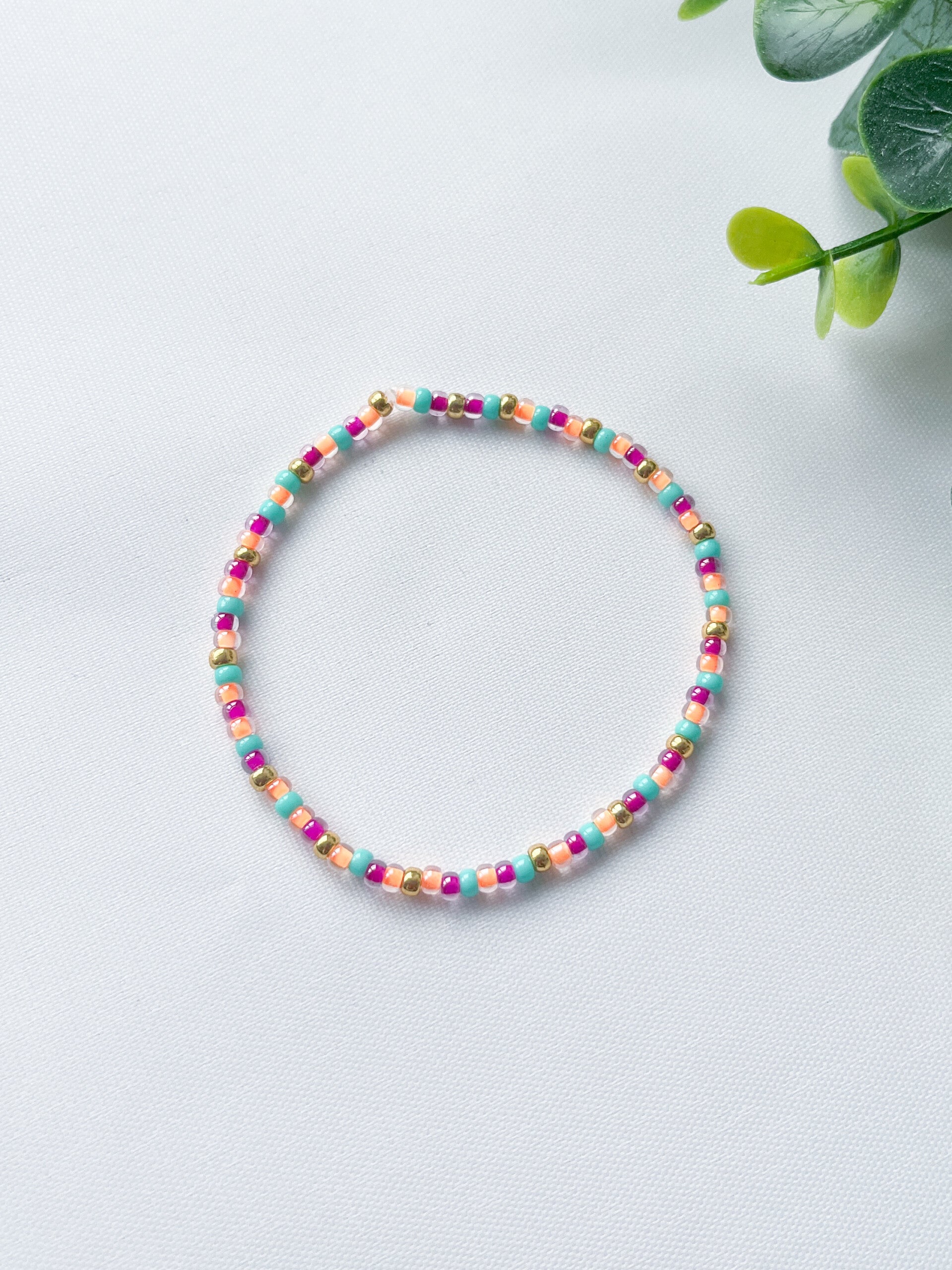 Het setje bestaat uit een armbandje, volledig gemaakt van Miyuki kralen in een zomerse combinatie van fuchsia roze, turquoise, neon oranje en goud.