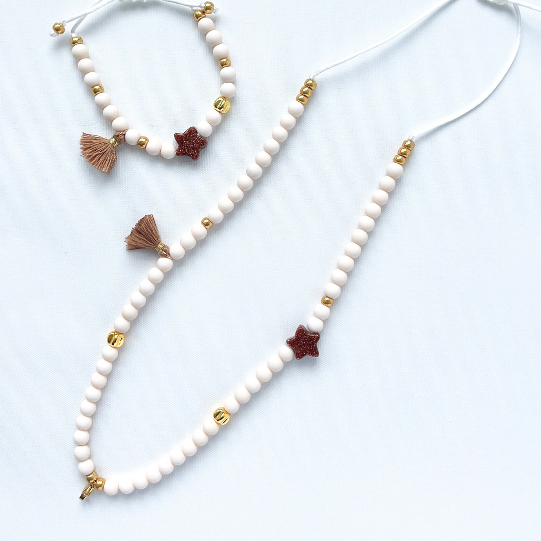 Deze prachtige ketting is gemaakt van hoogwaardige materialen, waardoor de ketting lang mooi blijft en jouw kindje er lang van kan genieten. De ketting is gemaakt van beige acrylkralen, afgewerkt met een kwastje en natuursteen met een glittertje in de vorm van een ster.