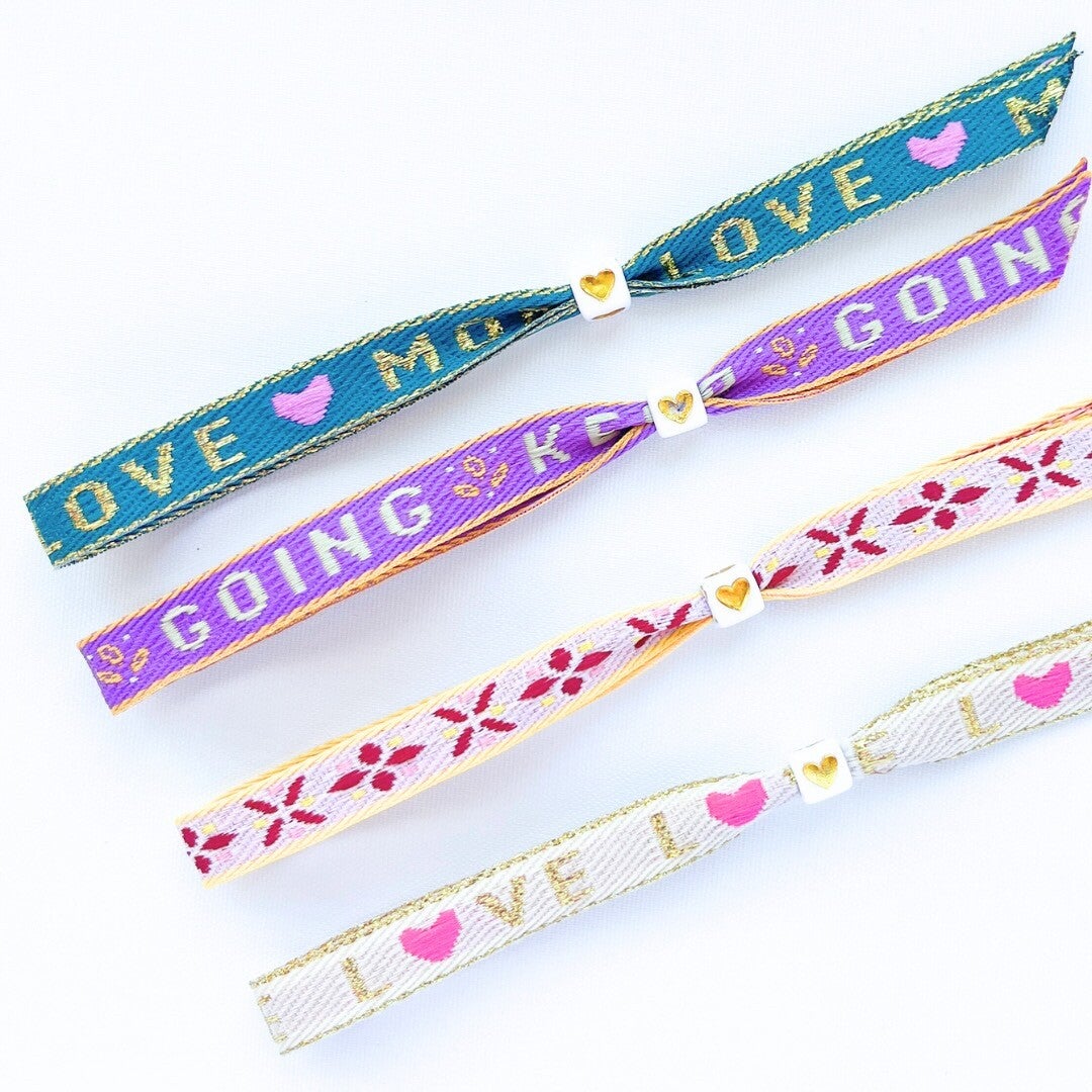 De lintarmbandjes zijn een echte hit en leuk te combineren met alle mooie outfitjes. De armband past altijd door de witte kraal met een goud hartje. Hiermee kun je makkelijk de armband losser en strakker maken.