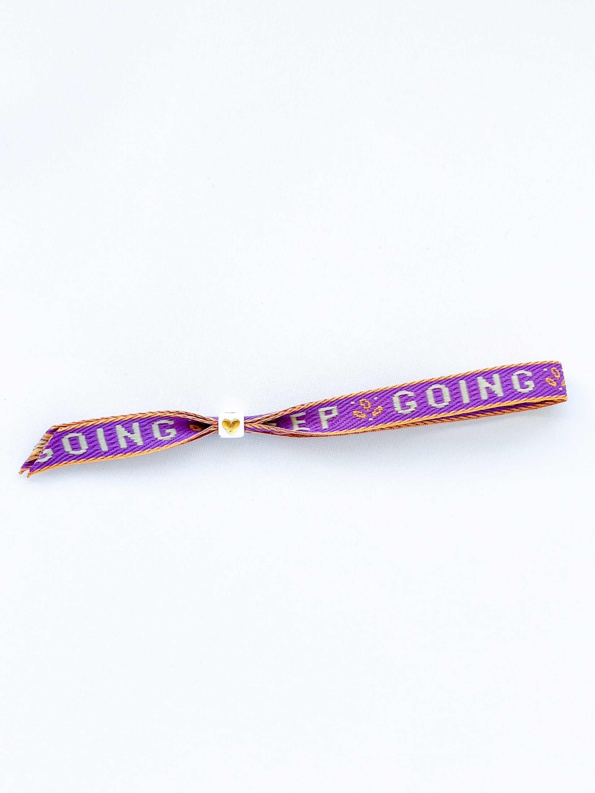Lintarmbandje 'Keep Going' is paars met oranje accenten en mint gekleurde tekst.