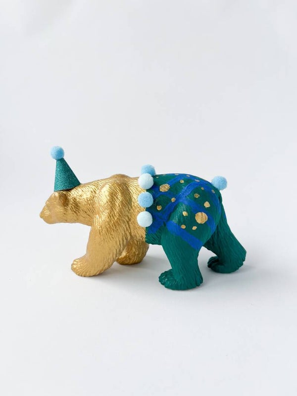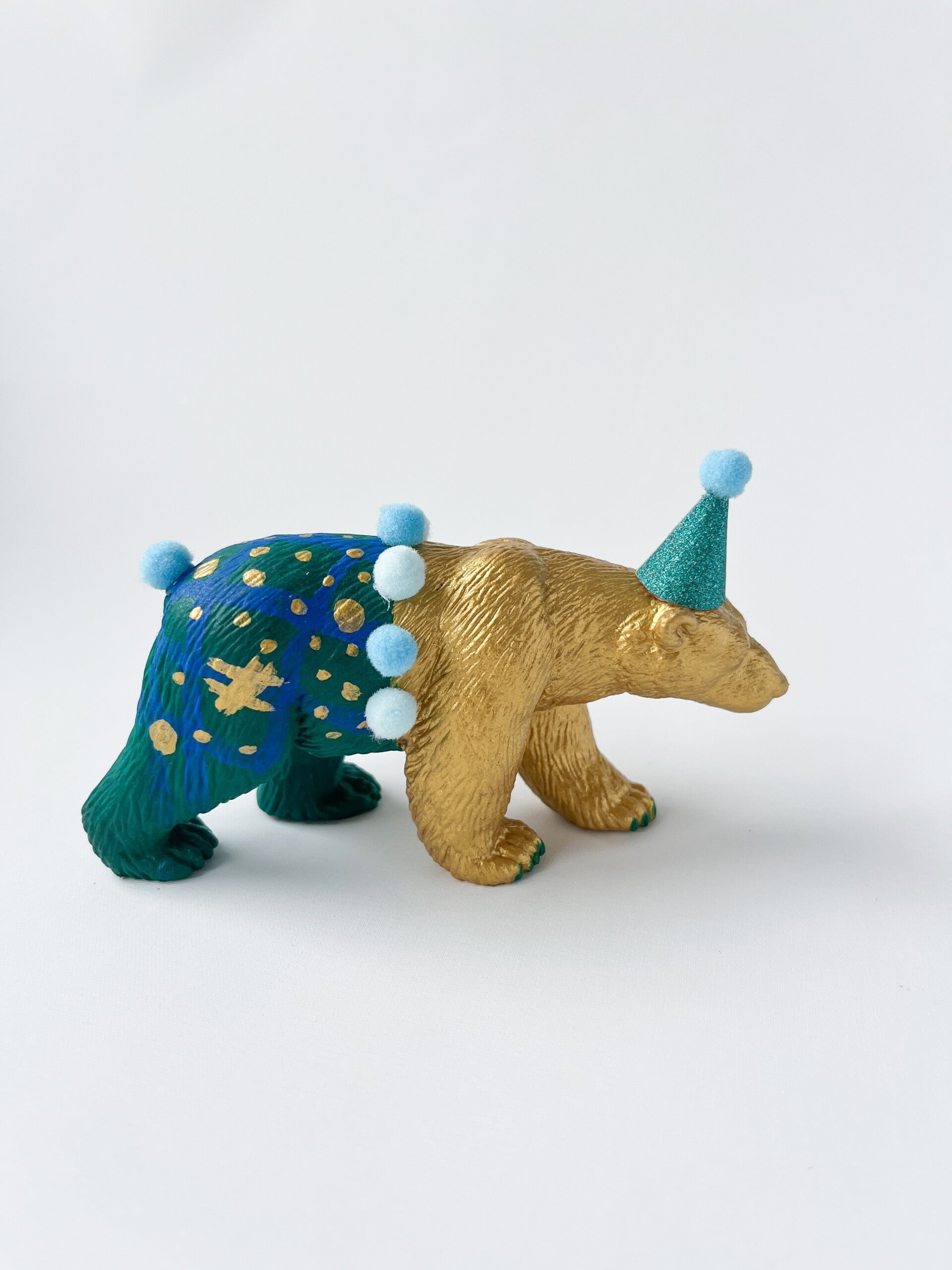 Onze gouden feestdieren zijn pre-loved speelgoedfiguren, zorgvuldig hergebruikt en met liefde omgetoverd tot unieke kunstwerkjes.