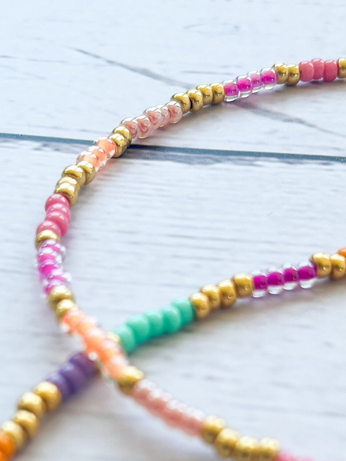 Deze vrolijke korte ketting is gemaakt van fijne, hoogwaardige Miyuki kraaltjes in een mix van frisse, zomerse kleuren. Subtiel, speels én stijlvol – perfect om te dragen als statement piece of juist in laagjes met andere kettinkjes.