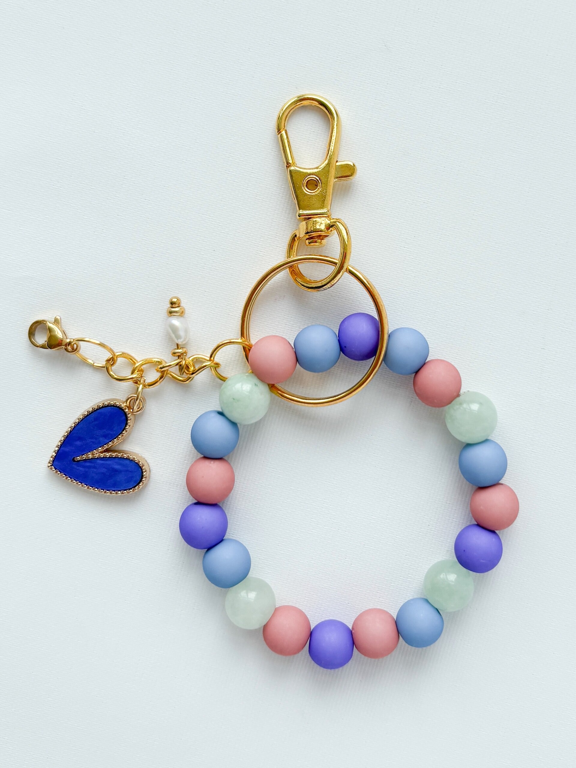 De bijpassende kralenarmband is gemaakt van stevig elastiek en zit vast aan de sleutelhanger – zo draag je 'm ook makkelijk om je pols!
